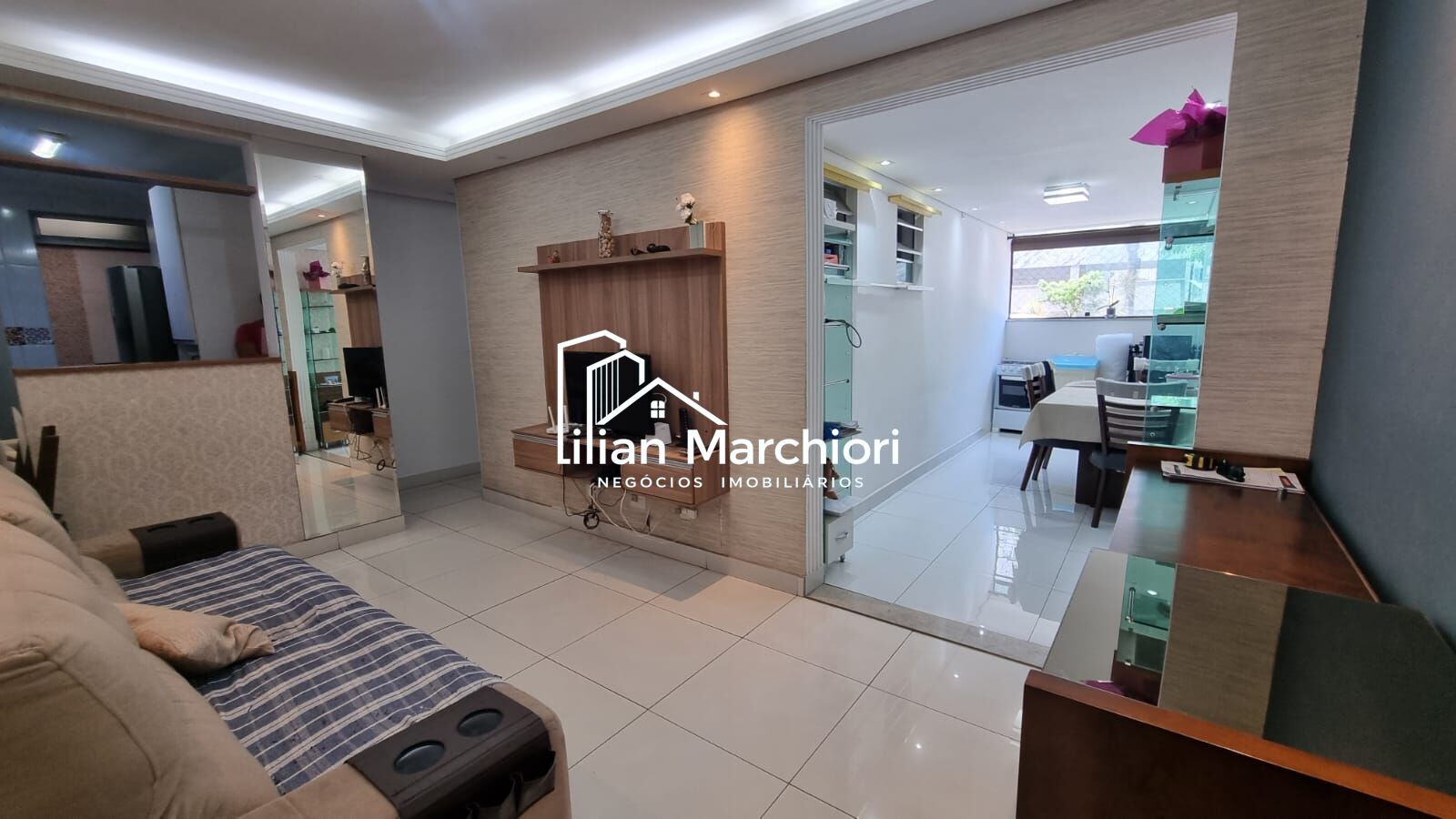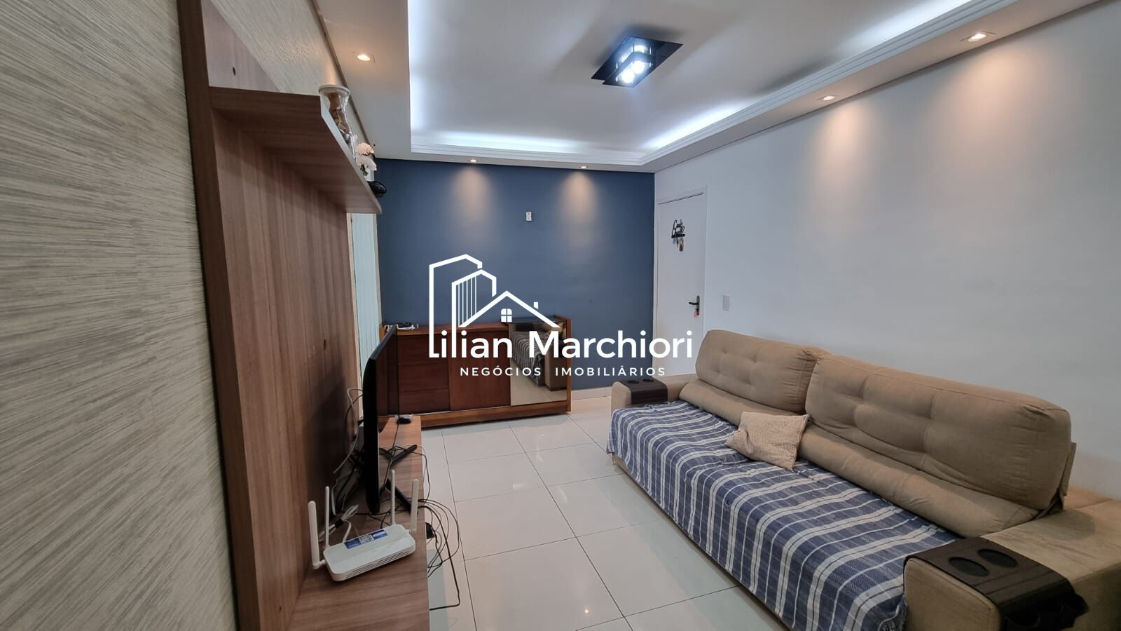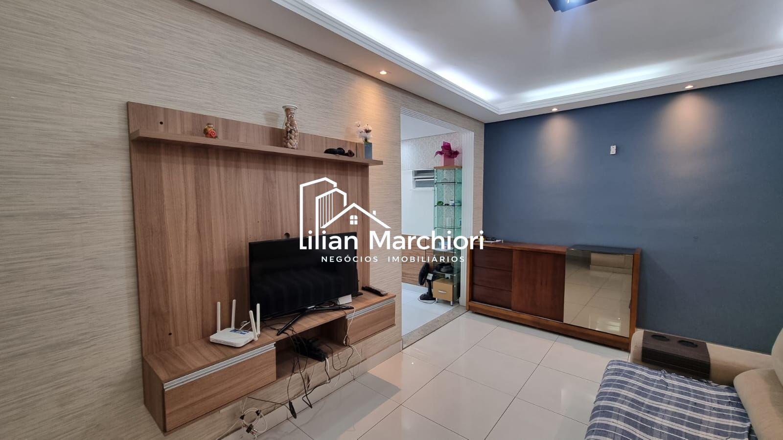 A sala ampla para dois ambientes conta com varanda estendida, piso em porcelanato e teto rebaixado, proporcionando um espaço elegante e bem iluminado.